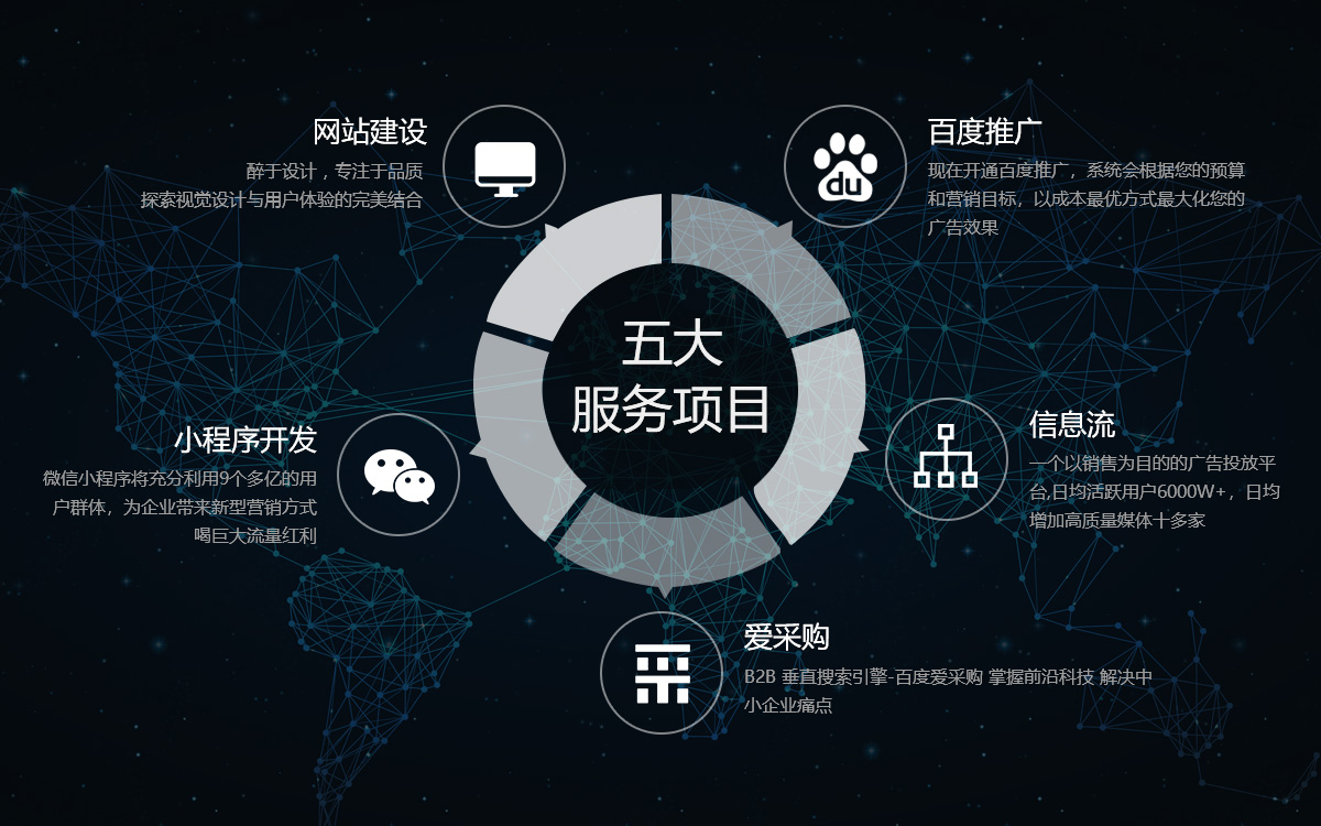 集團(tuán)以為企業(yè)提供最完善、最有效的網(wǎng)絡(luò)營(yíng)銷策劃方案為使命,目前擁有九家全資分公司,囊括電子、機(jī)械等在內(nèi)的 37個(gè)一級(jí)行業(yè)和201個(gè)二級(jí)行業(yè)。業(yè)務(wù)覆蓋青島、濟(jì)南、煙臺(tái)、濰坊、威海、日照、臨沂等山東半島,經(jīng)營(yíng)業(yè)務(wù)主要有搜索推廣、直通車、糯米、信息流、全景地圖、金融、滴滴打車、網(wǎng)絡(luò)增值、瑞思英語(yǔ)九大模塊,是搜索、糯米、金融、滴滴打車等互聯(lián)網(wǎng)企業(yè)在山東半島的獨(dú)家運(yùn)營(yíng)商與合作伙伴。